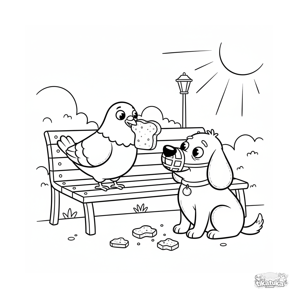 Página para colorear para niños 4-6: una paloma alimenta a un perro viejo junto a un banco. Escena conmovedora sobre amistad.