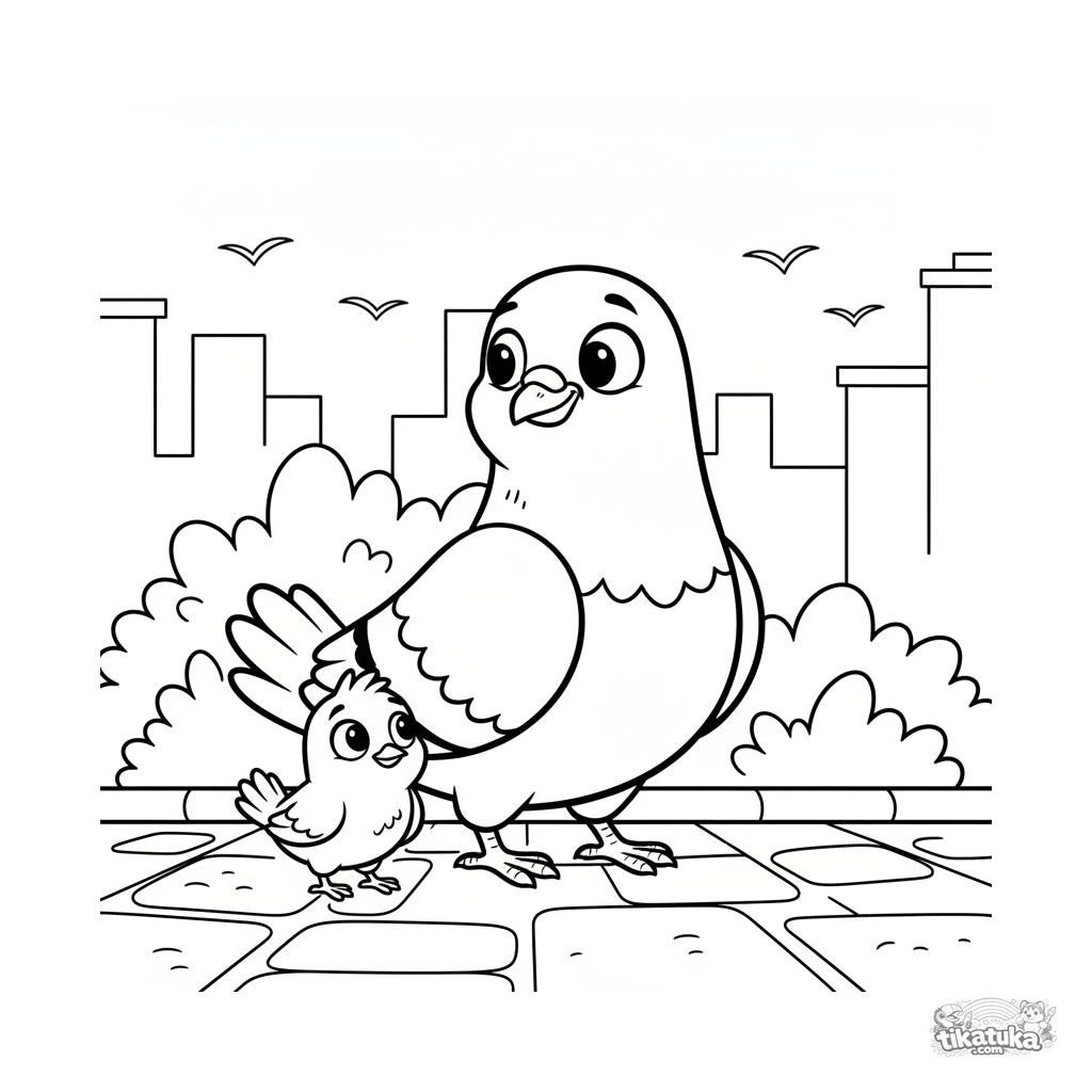 Página para colorear para niños: una paloma urbana guía a un polluelo perdido por un sendero. Conmovedora escena de protección y ayuda en migración.