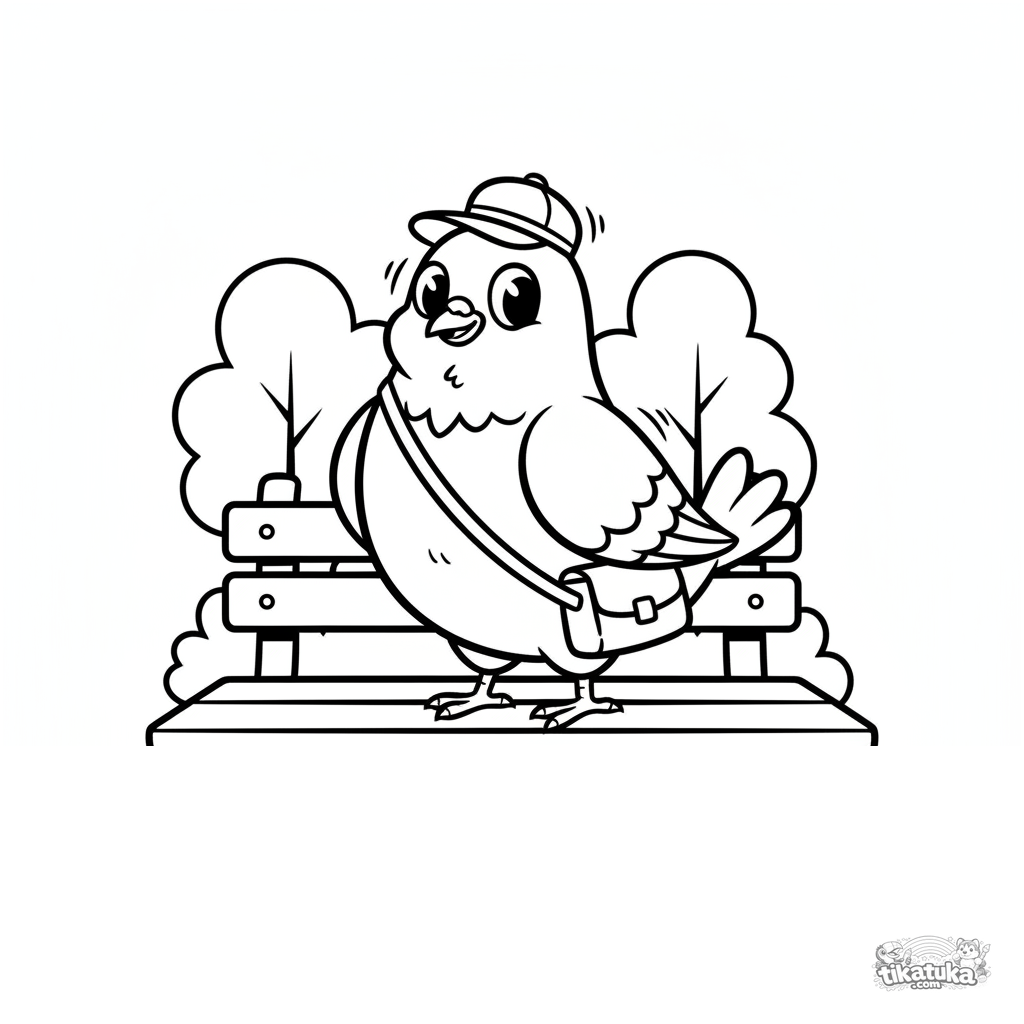 Página para colorear para niños de 4-6 años: una paloma con gorra de mensajero saca una nota de su bolsa en un banco del parque. Estilo retro.