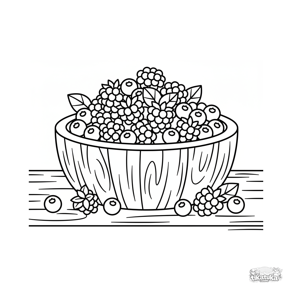 Página para colorear de un cuenco de madera lleno de bayas mixtas. Para niños de 4-6 años. En una encimera hay frambuesas, moras, arándanos y hojas esparcidas.