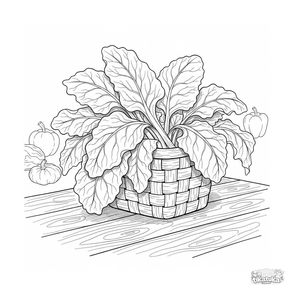 Página para colorear de un montón de acelgas arcoíris saliendo de una cesta de mimbre. Para 7-9 años. Enfoque en textura de hojas y formas naturales.