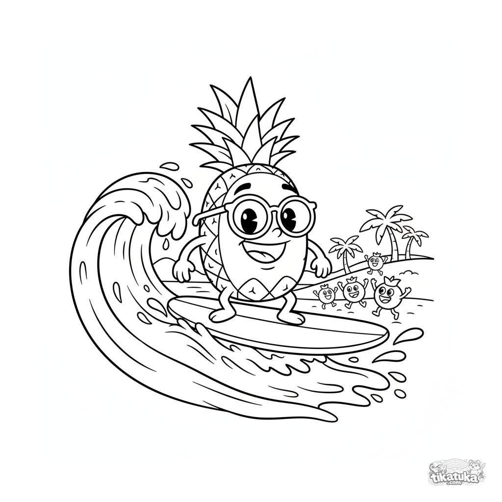 Página divertida para colorear: una rodaja de piña con gafas de sol surfeando una ola de jugo. Para niños de 7-9 años.