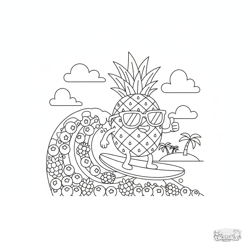 Página para colorear divertida para 7-9 años: una piña con gafas de sol surfea una ola de bayas. Escena dinámica estilo dibujos animados de los 90.