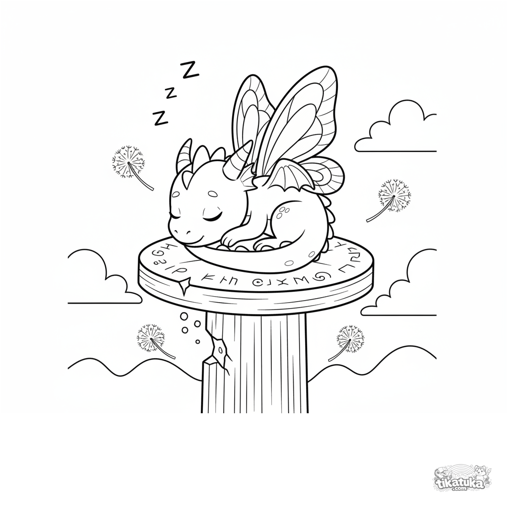 Página para colorear para niños 4-6: un diminuto dragón pixie duerme profundamente en una piedra rúnica redonda. Líneas suaves y fluidas, estado de ánimo pacífico, formas claras.