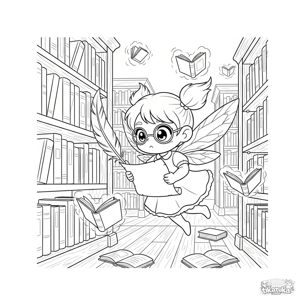 Página para colorear para 7-9 años: una duendecita bibliotecaria ordena libros brillantes en una biblioteca mágica. Escena de fantasía con detalles.