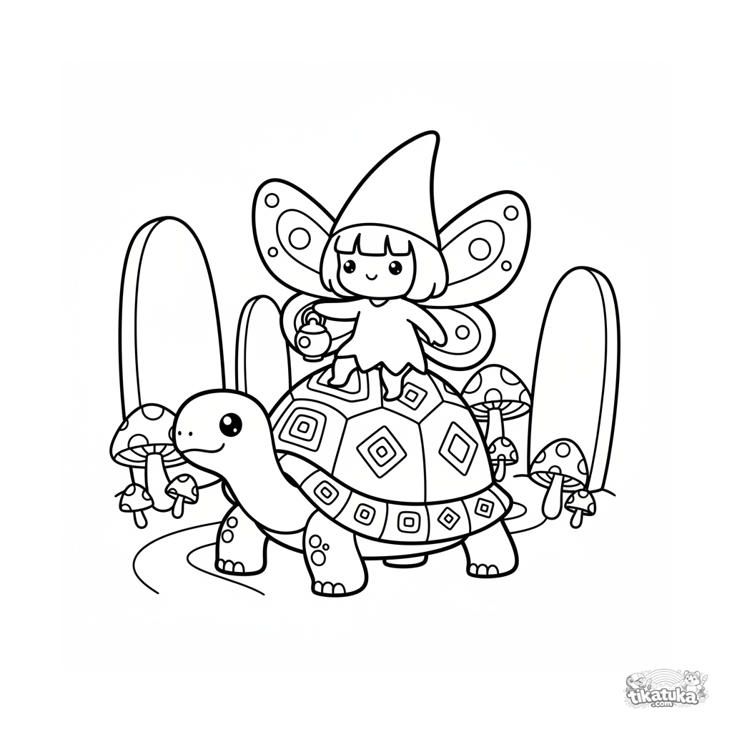 Página para colorear para niños pequeños de 2-3 años: un pequeño duendecillo monta una tortuga por un sendero entre monolitos antiguos. Contornos muy simples.