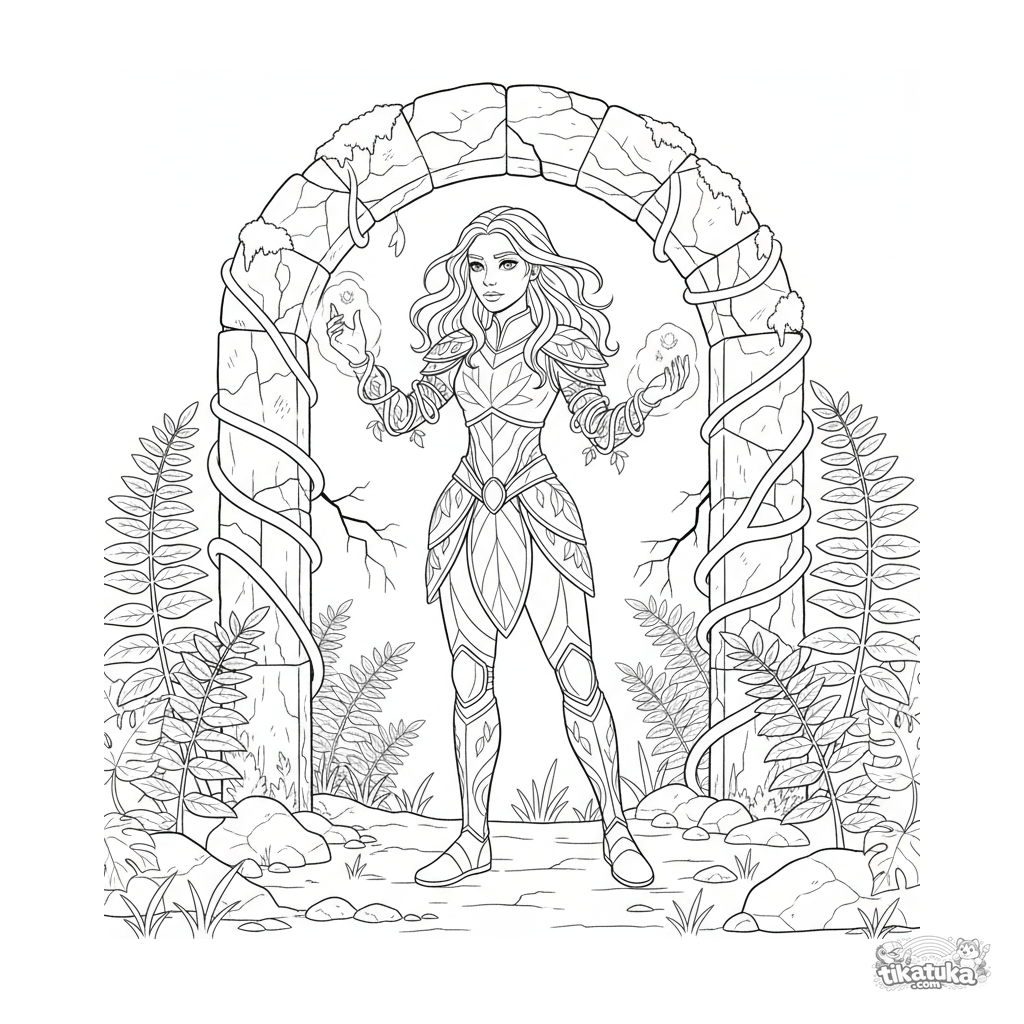 Página para colorear para mayores 10-12: un superhéroe con poderes vegetales usa enredaderas brillantes para reparar un arco de piedra en ruinas boscosas.