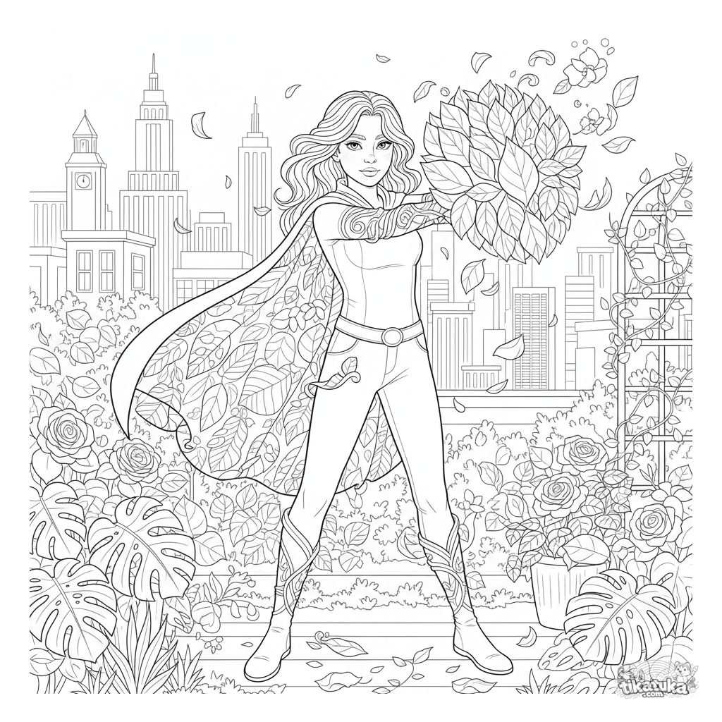Página para colorear para niños mayores de 10-12 años: un superhéroe con poder de plantas crea un escudo de hojas en un jardín en la azotea.