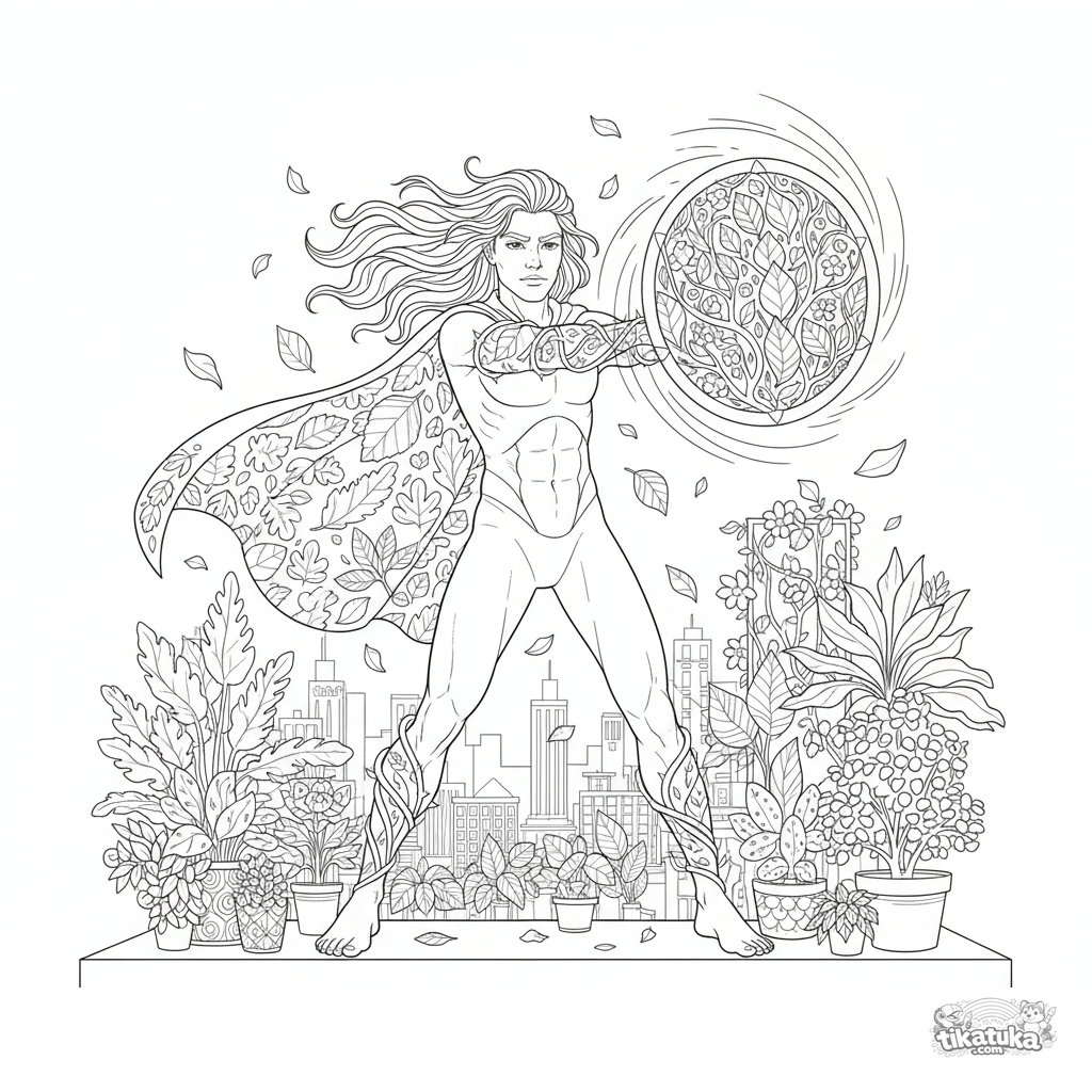 Página para colorear para 10-12 años: un superhéroe con poderes vegetales crea un escudo de hojas en un jardín de azotea urbano. Escena detallada.