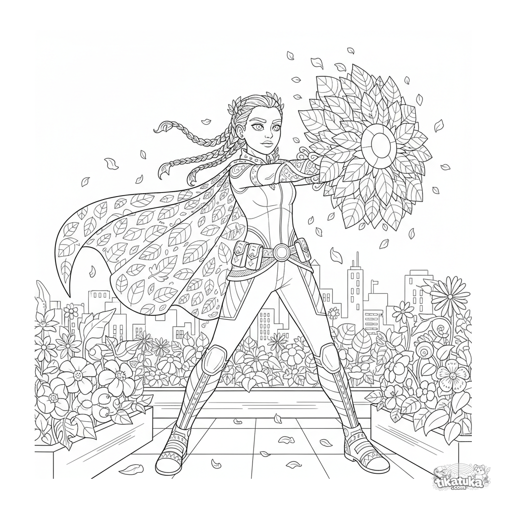 Página para colorear para niños mayores 10-12: un superhéroe con poderes vegetales crea un escudo de hojas en un jardín de azotea.