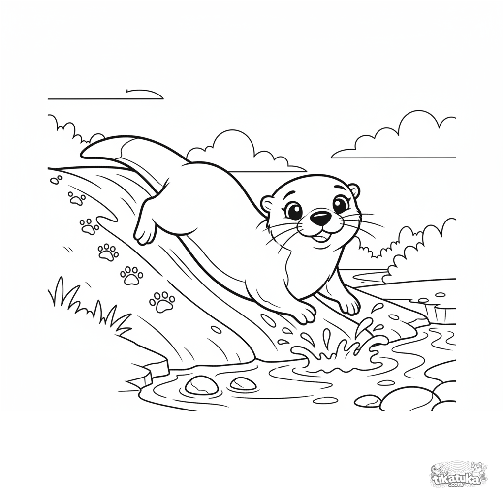 Página para colorear divertida para niños 4-6: una nutria juguetona deslizándose por una orilla fangosa hacia un arroyo claro. Escena dinámica y graciosa en estilo de dibujos animados de los 90.