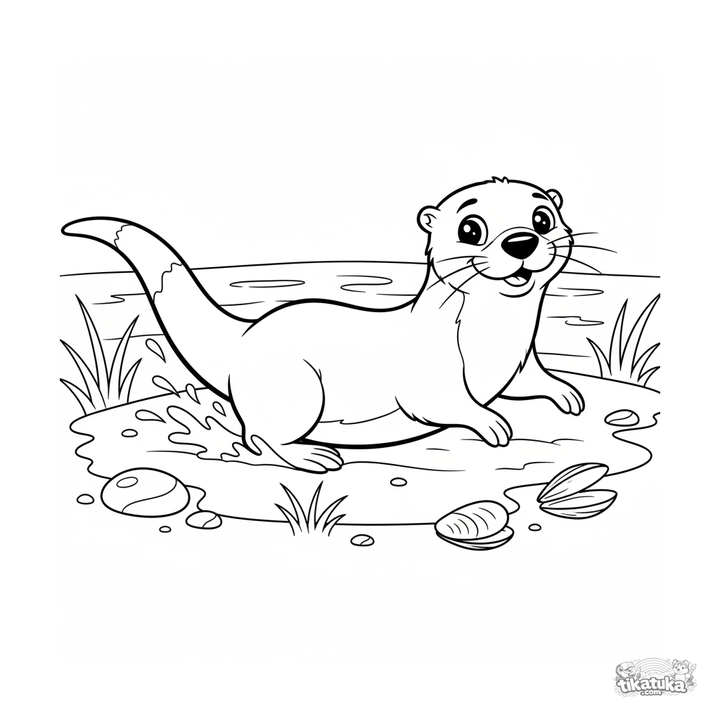 Página para colorear para 7-9 años: una nutria juguetona se desliza por una orilla fangosa. Escena dinámica con salpicaduras y conchas.
