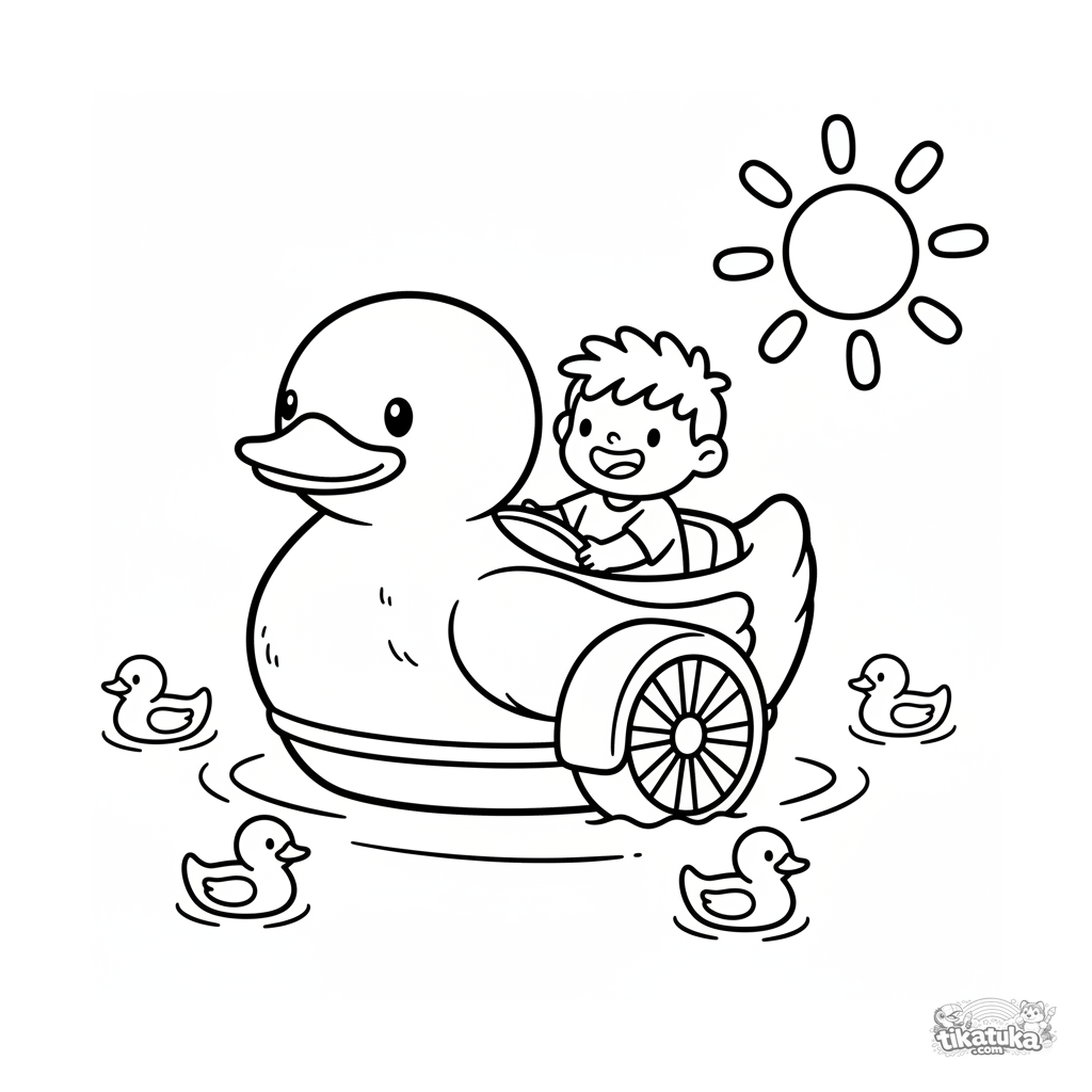 Página para colorear para niños pequeños: un barco gigante con forma de pato flota en un estanque tranquilo.