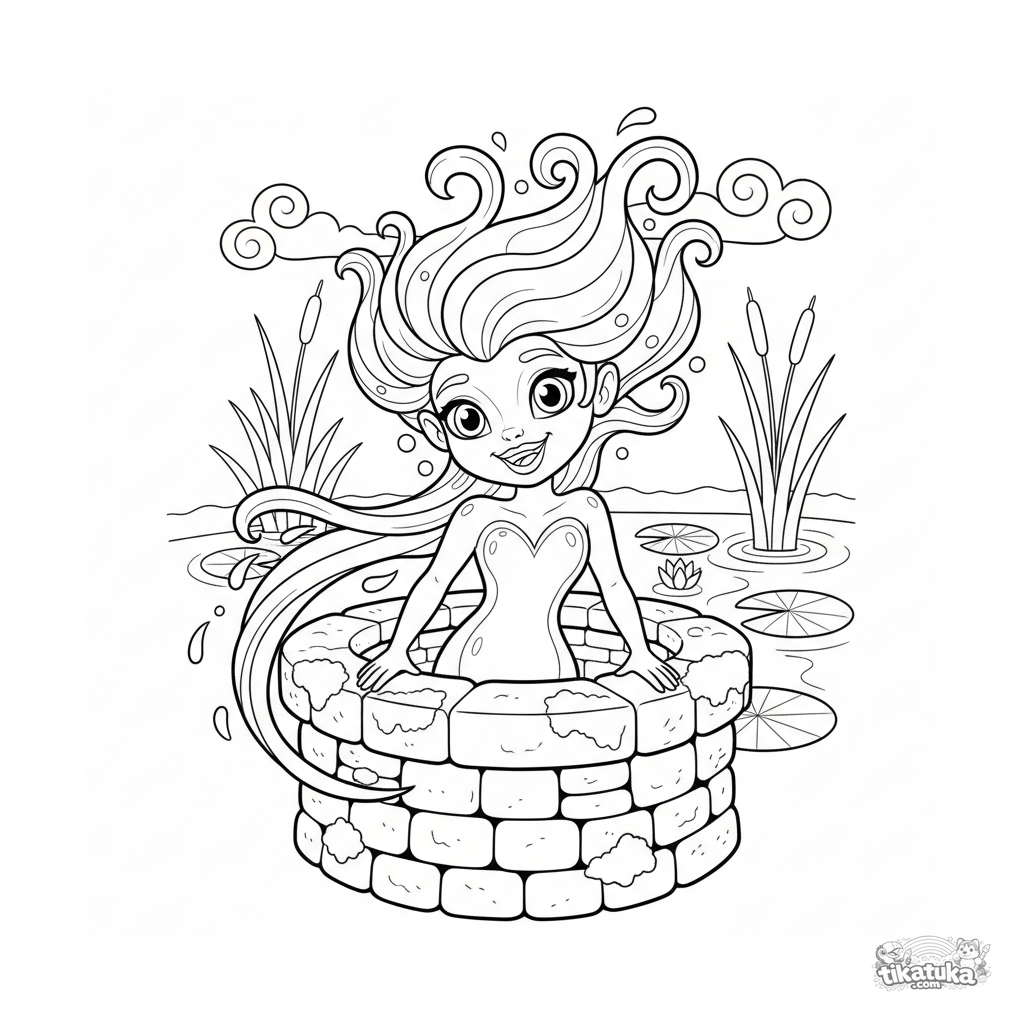 Página para colorear para preadolescentes 7-9: un espíritu de agua juguetón asoma desde el pozo de agua viva. Estilo Art Nouveau con líneas fluidas y ambiente mágico.