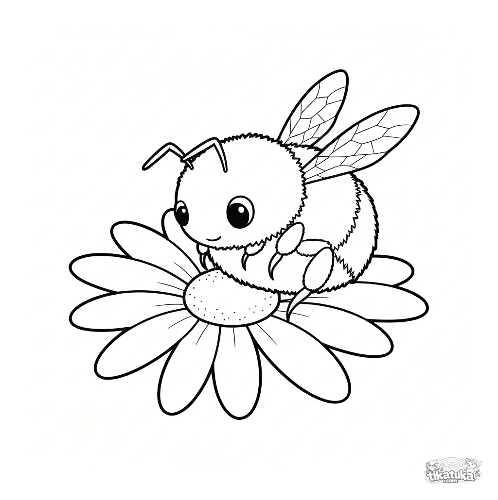 Página simple para colorear para bebés: un abejorro esponjoso en un pétalo de margarita. Imagen grande con contornos gruesos para niños desde 2 años.