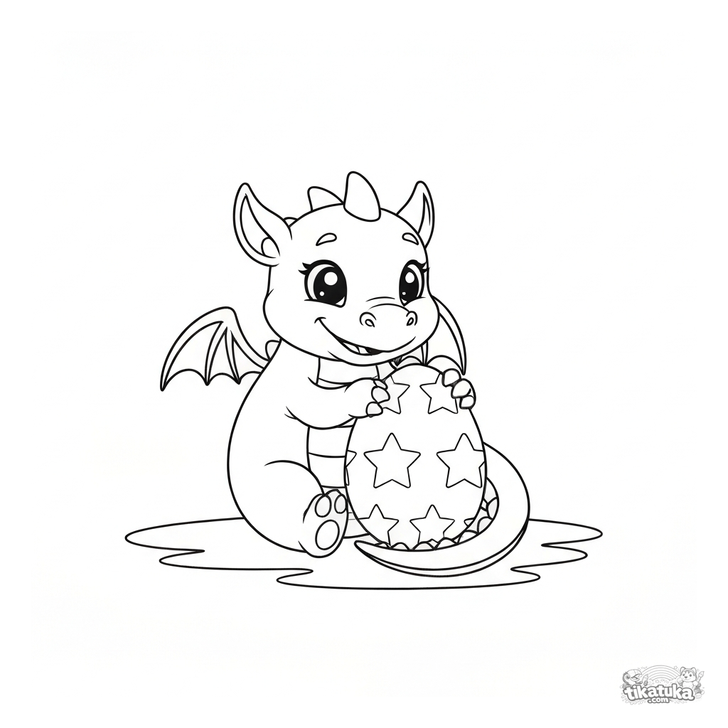 Página para colorear para niños: un dragón bebé redondo y amigable guarda un huevo grande con patrón de estrellas. Escena de cuento simple y linda.
