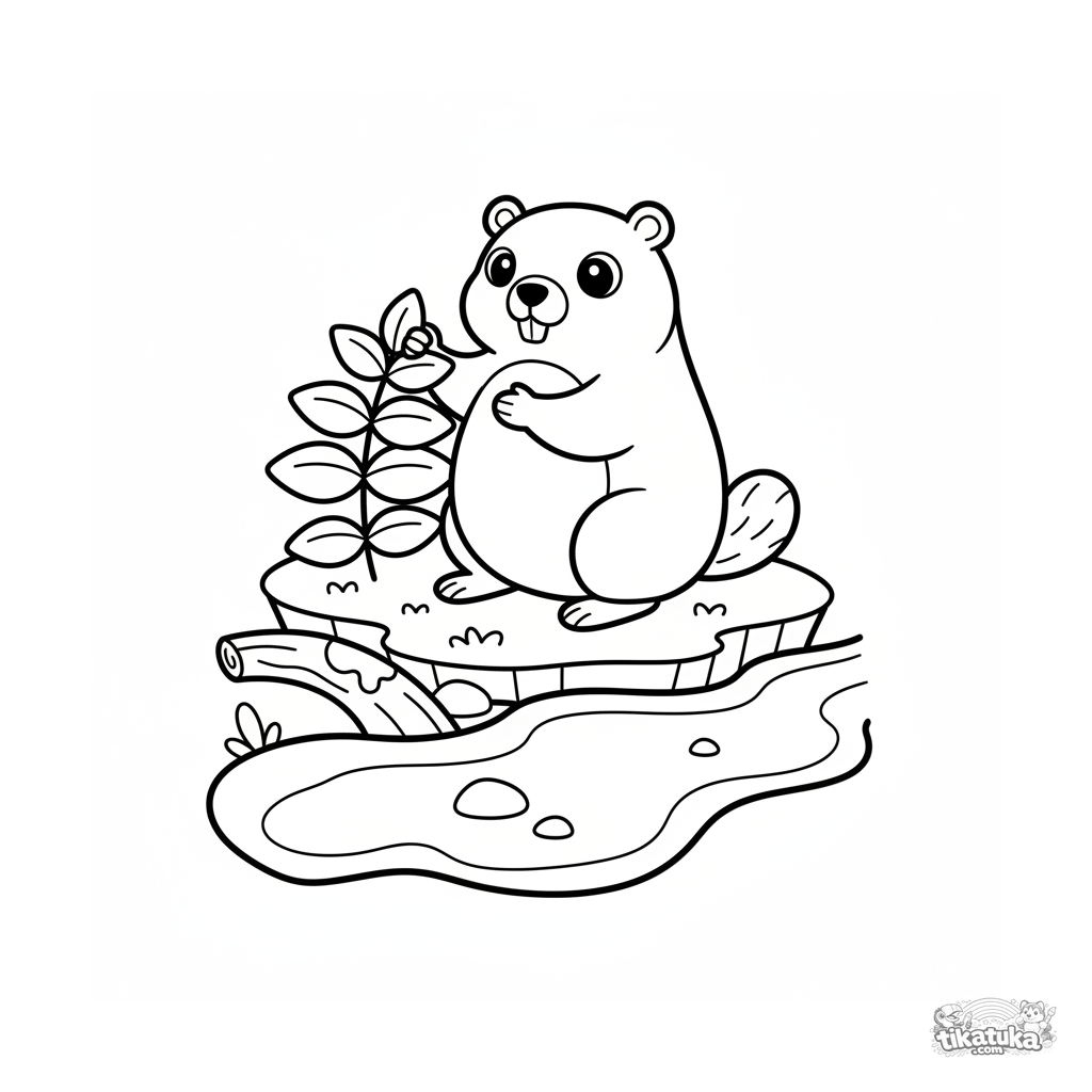 Página para colorear para niños pequeños: una marmota regordeta con la nariz curiosa está en la orilla de un arroyo claro, oliendo menta silvestre.