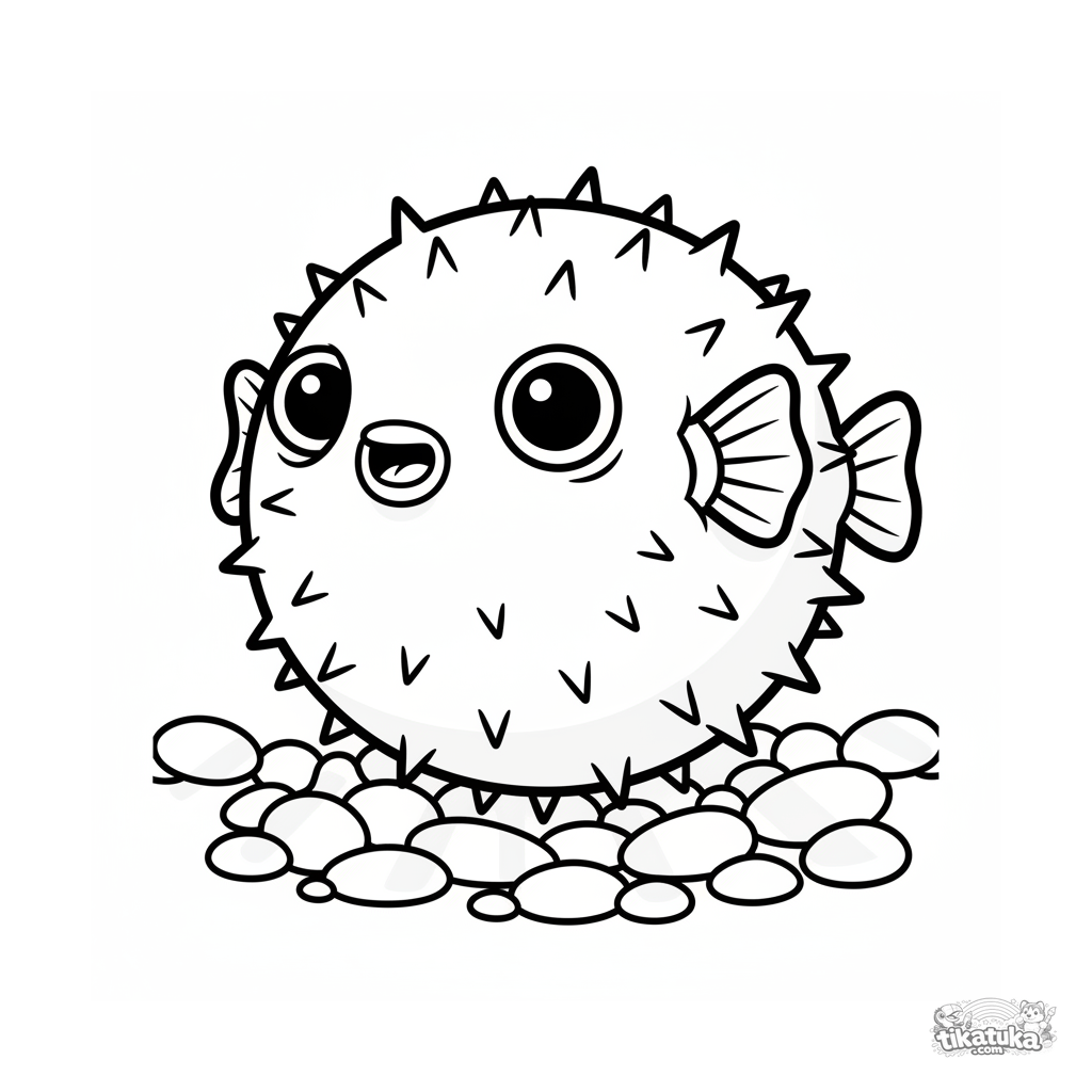 Página para colorear simple para niños de 2-3 años: un pez globo redondo inflado entre guijarros en aguas soleadas y poco profundas.