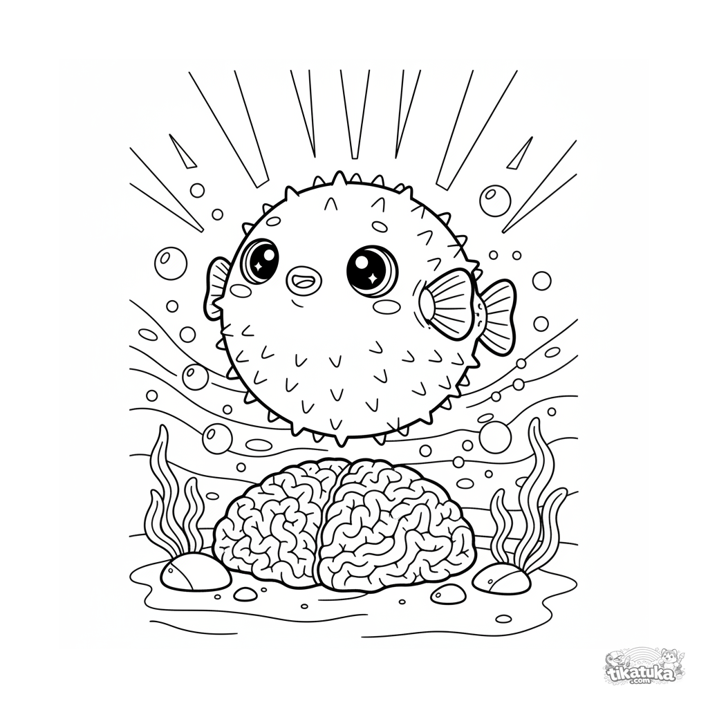 Página para colorear de un divertido pez globo inflándose cerca de corales bajo rayos de sol. Para niños de 7 a 9 años.