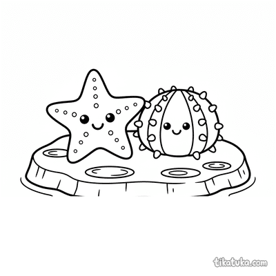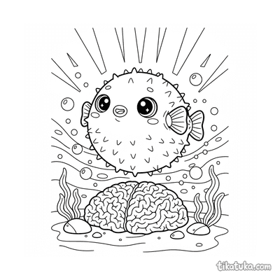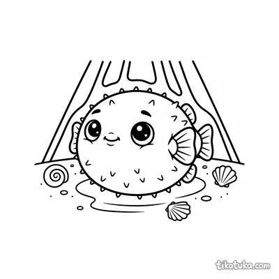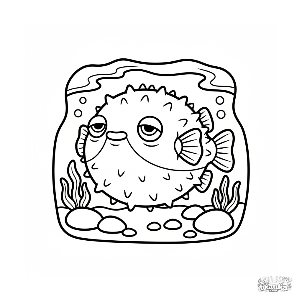 Página para colorear simple para niños pequeños de 2-3 años: Un pez globo redondo descansa en un charco de marea soleado en aguas poco profundas.