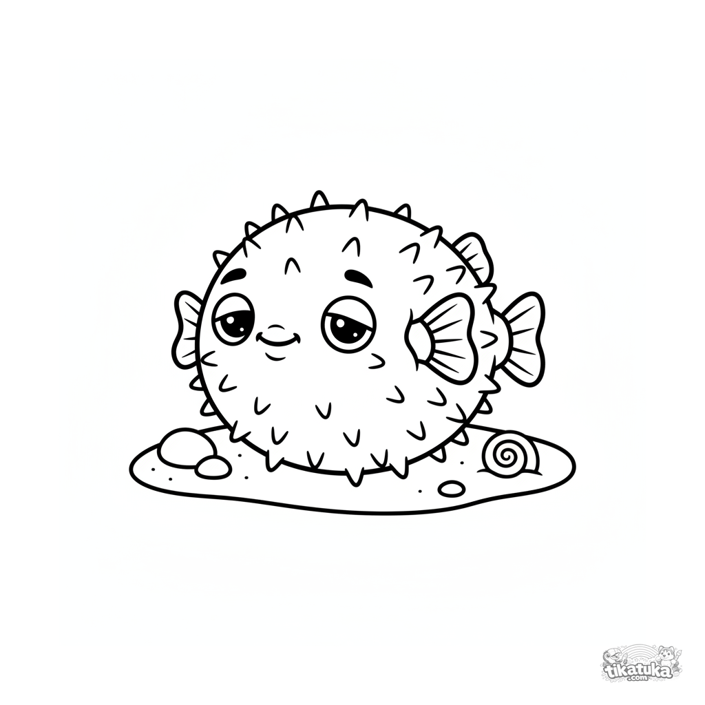 Página para colorear simple para niños pequeños de 2-3 años: un pez globo redondo descansa en arena cálida al sol. Formas grandes y simples perfectas para primeros crayones.