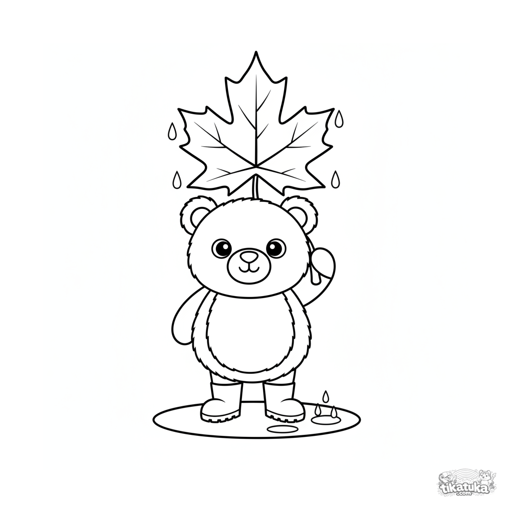 Página para colorear para niños pequeños 2-3: un oso de peluche con botas bajo una hoja de arce como paraguas en lluvia otoñal.