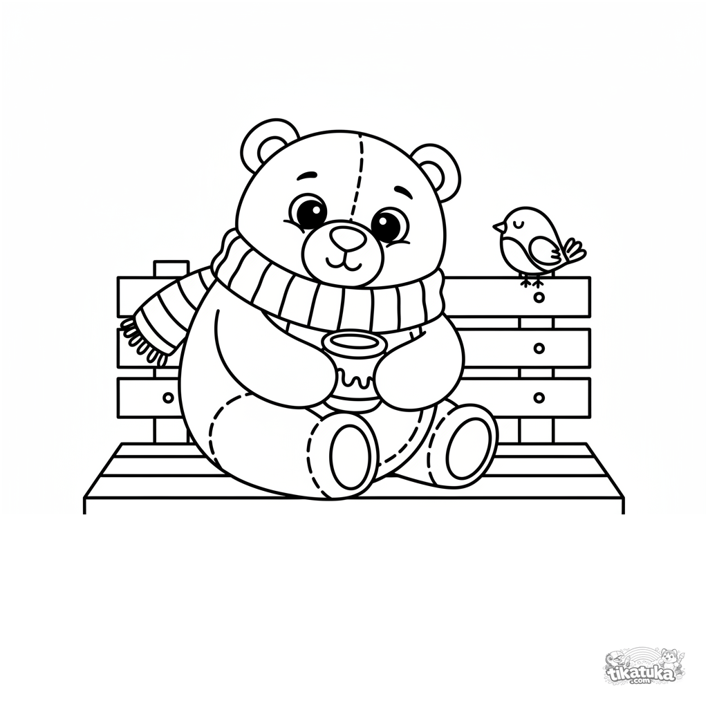 Página para colorear simple para niños de 2-3 años: un oso de peluche durmiendo en un banco del parque. Formas grandes, pocos detalles.