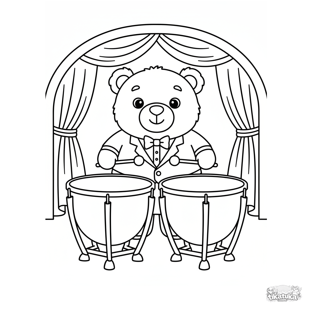 Página para colorear para bebés: un oso de peluche en esmoquin toca timbales en el escenario. Formas grandes y simples, márgenes amplios. Para niños de 2 a 3 años.