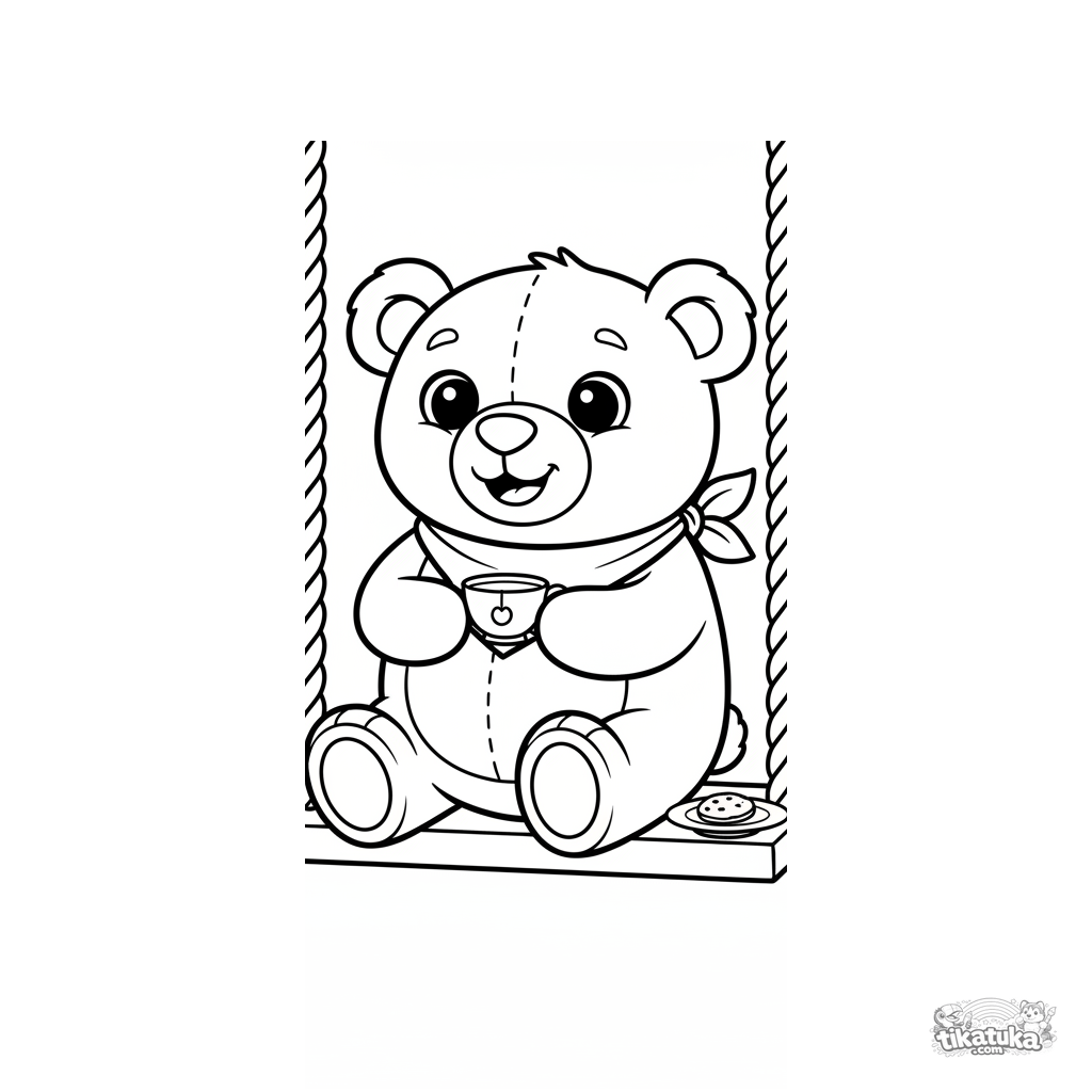 Página para colorear para niños pequeños 2-3 años: un gran oso de peluche se sienta en un columpio en el porche sosteniendo una taza de té. Formas simples.