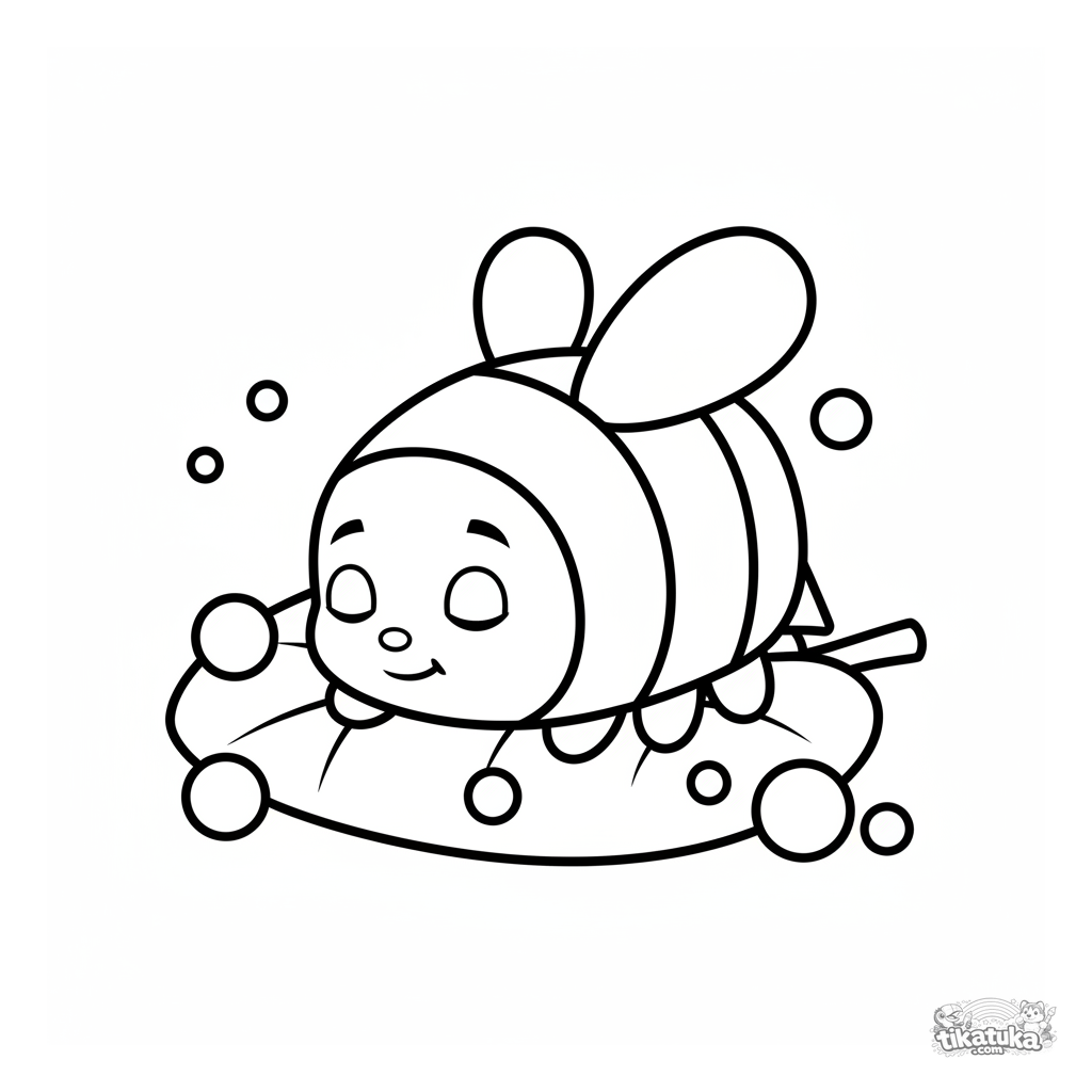 Página simple para colorear para bebés 2-3: un abejorro de peluche duerme en una hoja grande con gotas de rocío. Formas grandes, detalles mínimos.