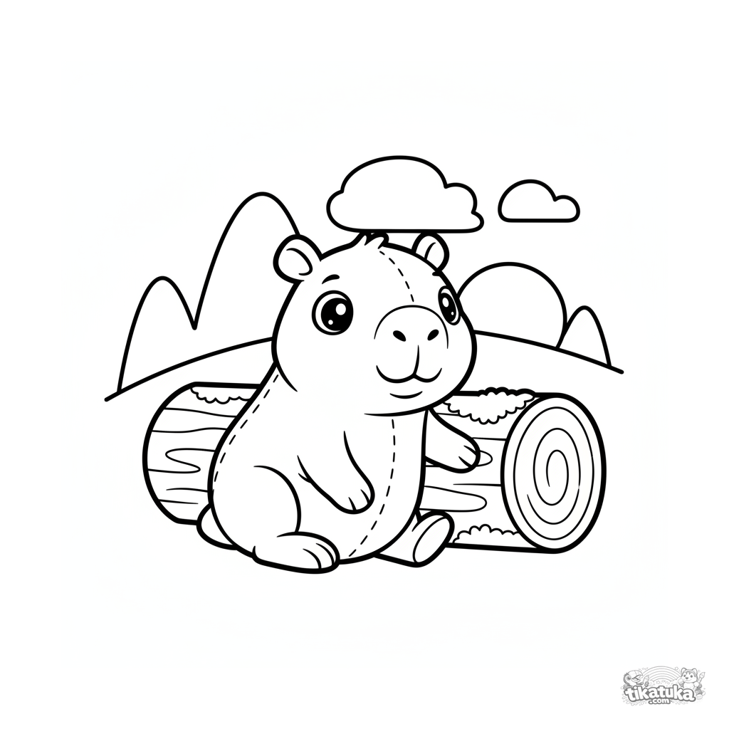 Página para colorear simple para niños pequeños 2-3: un carpincho de peluche recostado en un tronco, mirando el atardecer. Formas grandes, pocos detalles, perfecto para los más pequeños.
