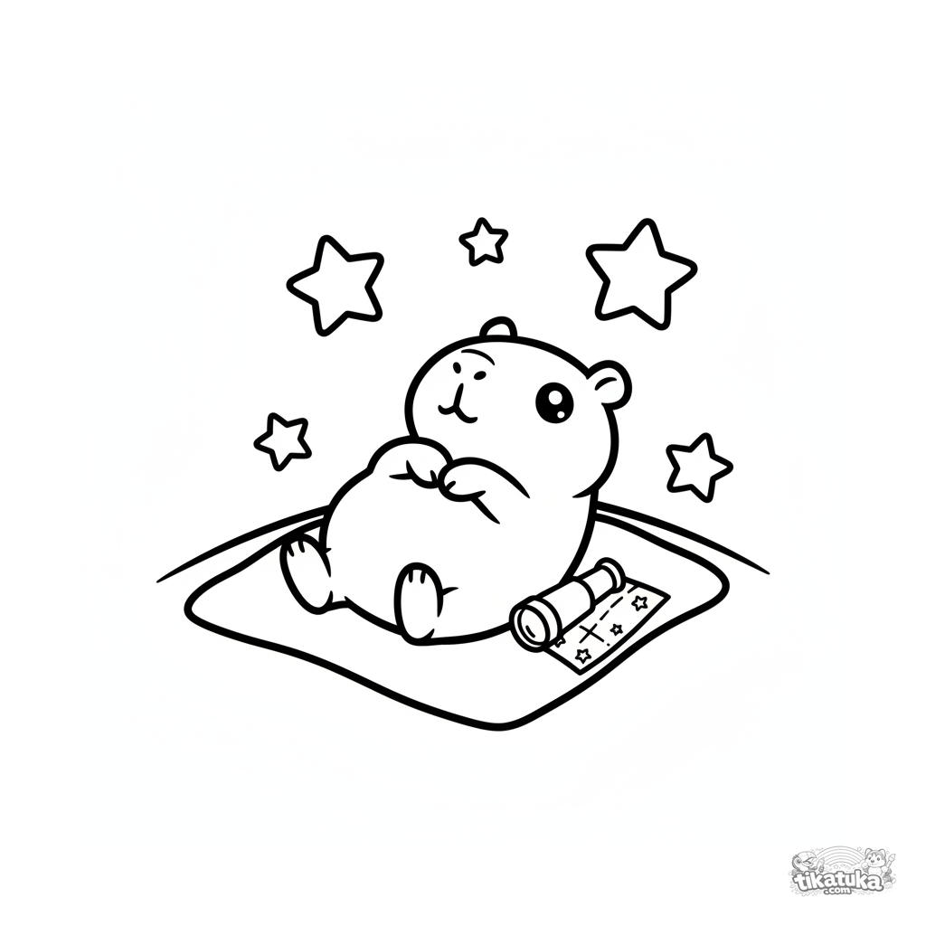 Página simple para los más pequeños: un carpincho de peluche mira las estrellas al anochecer. Formas grandes y suaves.