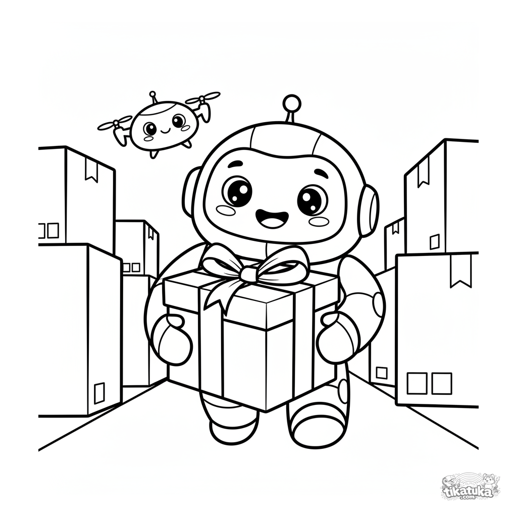 Página para colorear para bebés 2-3: un lindo robot de peluche repartidor llevando una caja por un almacén. Formas muy simples y redondas, áreas enormes para colorear.