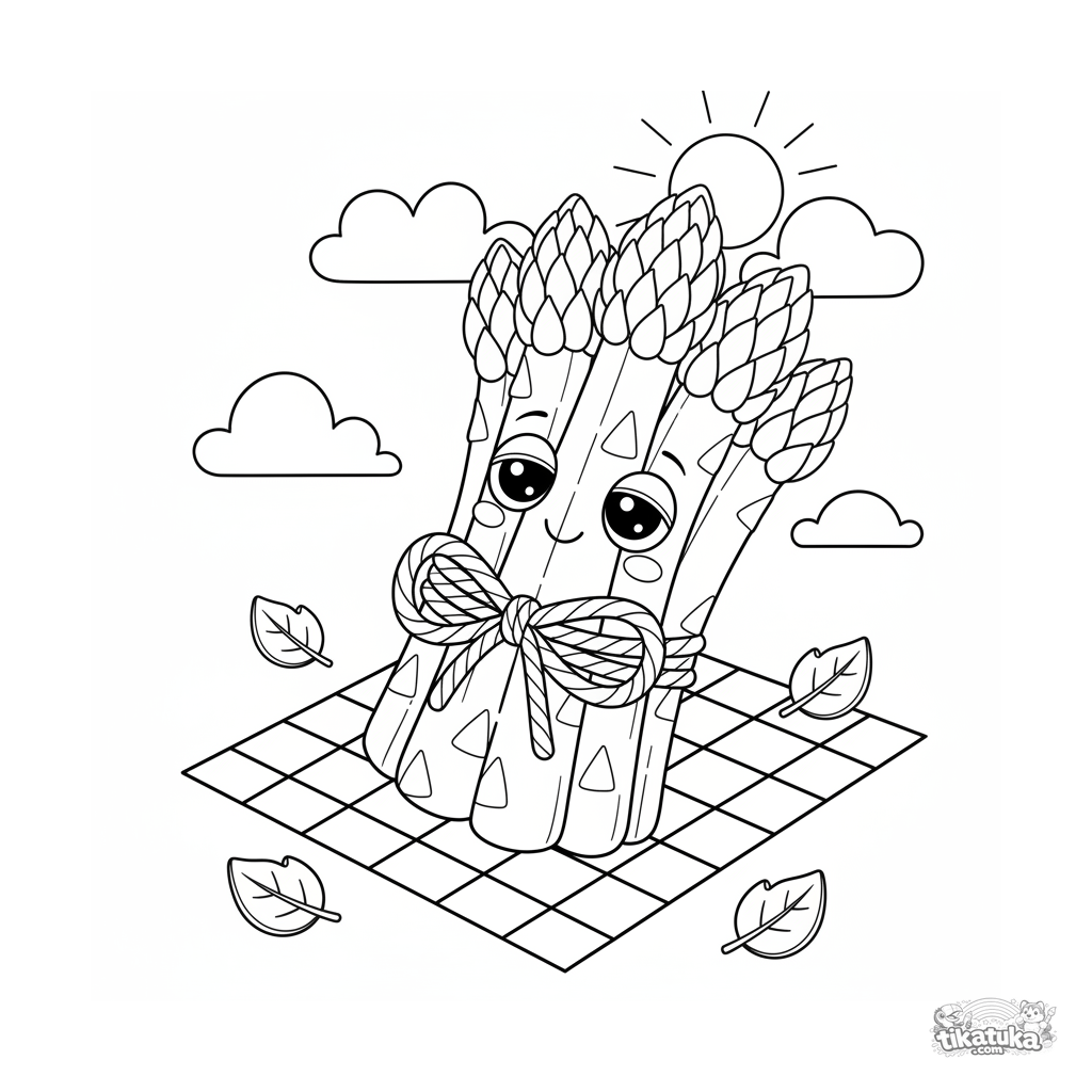 Un tierno manojo de espárragos de peluche durmiendo en una manta de picnic. Página para colorear para niños de 4-6 años.