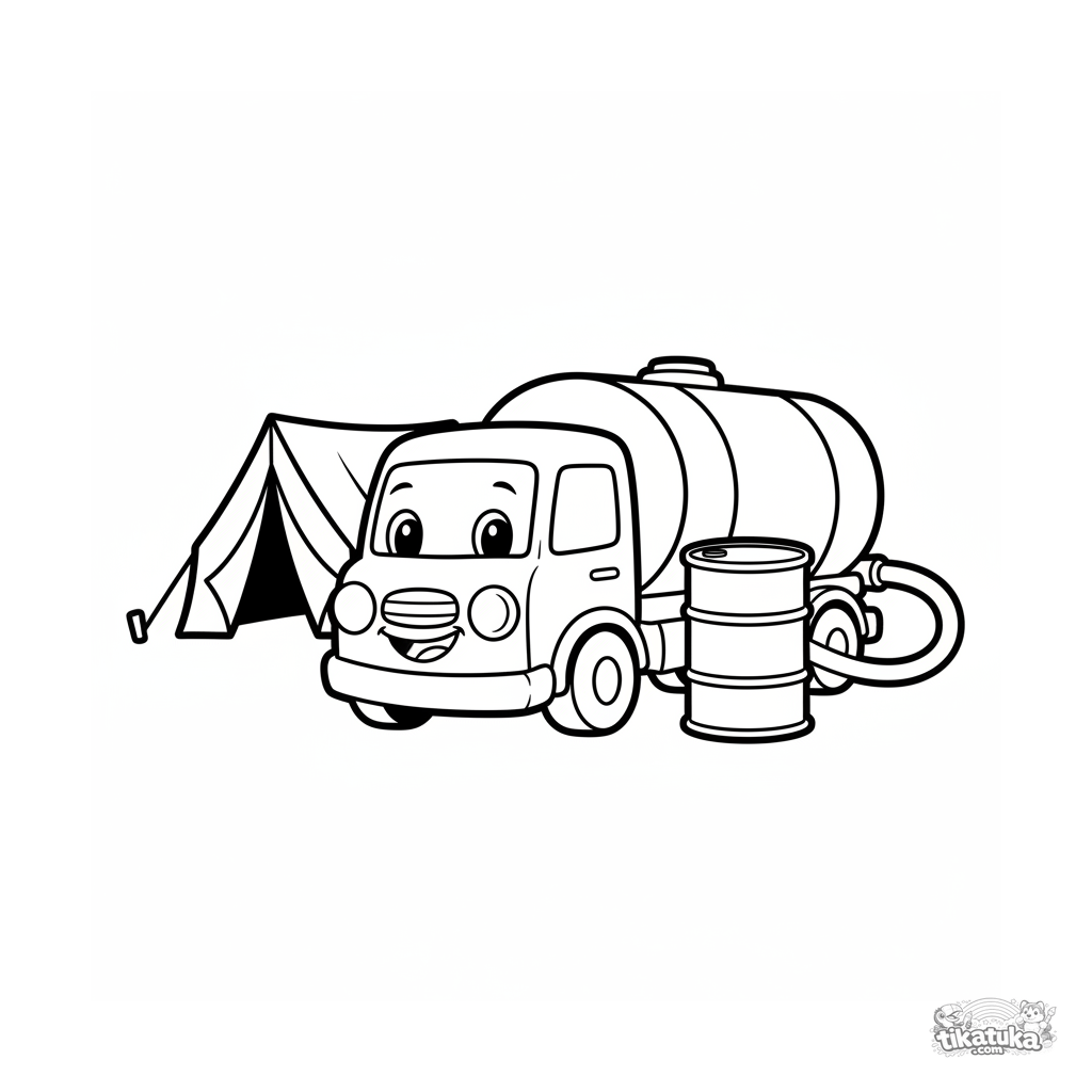 Página muy simple para colorear para niños de 2-3 años: un camión cisterna amigable como un peluche está estacionado junto a una tienda de suministros.