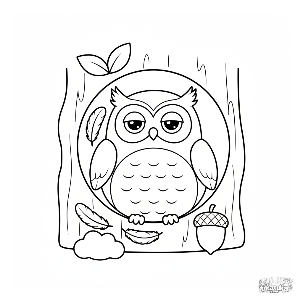 Página para colorear simple para los más pequeños: un búho de peluche acurrucado en un hueco de árbol. Formas grandes y márgenes amplios para 2-4 años.