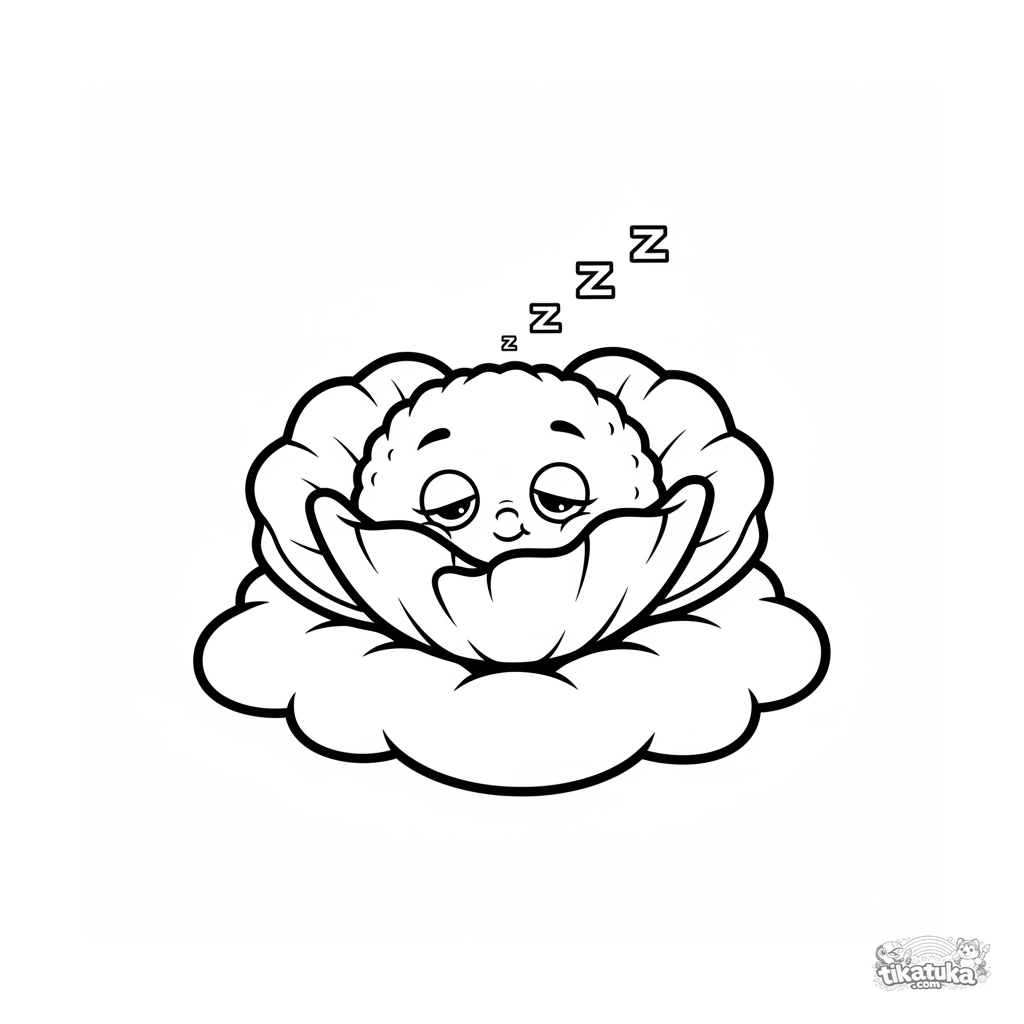 Página para colorear para bebés 2-3 años: una amapola de peluche duerme plácidamente en una nube esponjosa. Formas grandes y simples, pocos detalles.