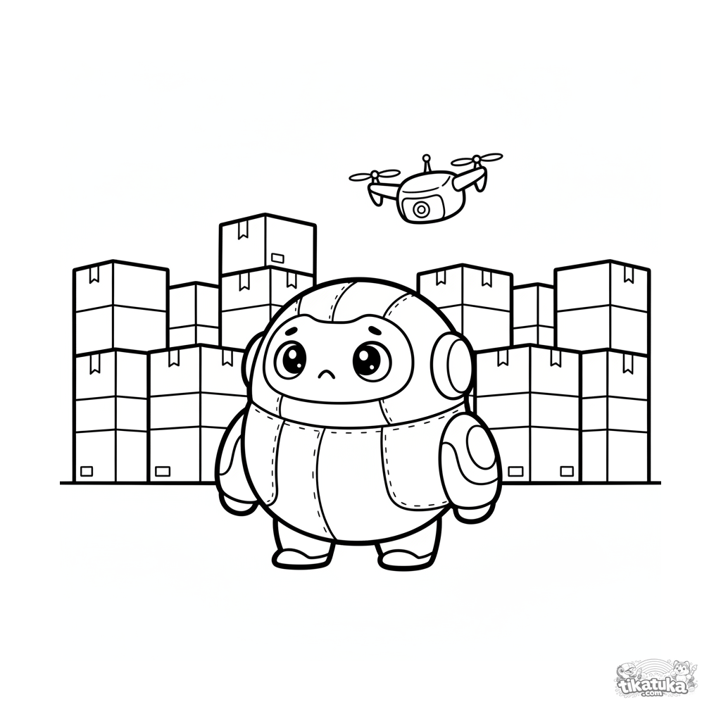 Página simple para colorear para los más pequeños: un lindo robot de peluche parece confundido entre cajas en un almacén. Formas grandes y suaves.
