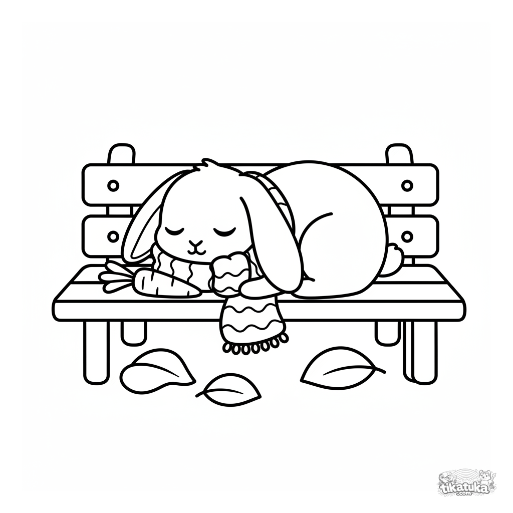 Página simple para colorear para niños pequeños 2-3: un lindo conejo de peluche duerme la siesta en un banco del parque.