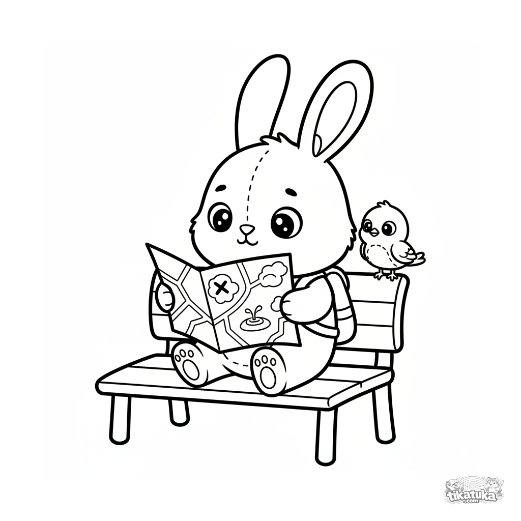 Página para colorear simple para niños pequeños 2-3: un conejo de peluche sentado en un banco del parque estudiando un mapa grande. Formas grandes, márgenes amplios.