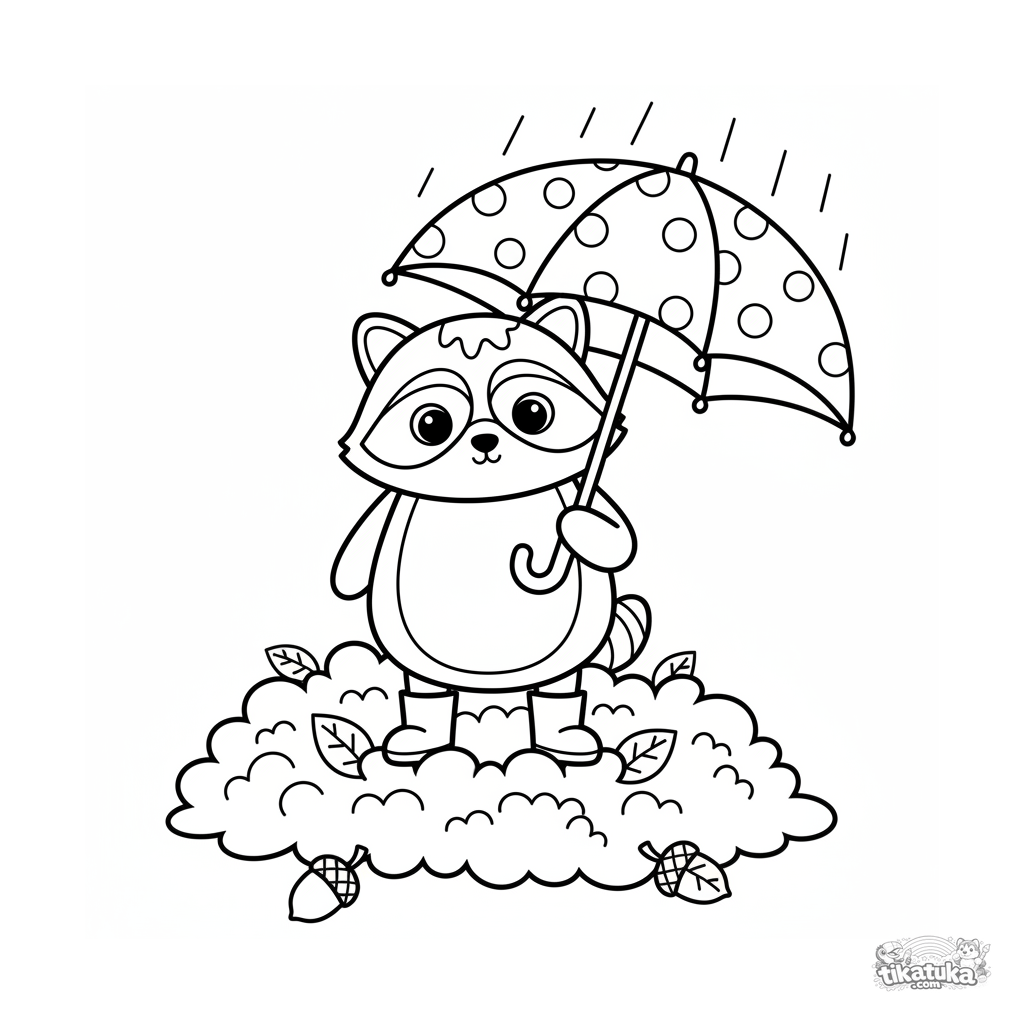 Página para colorear simple para niños pequeños 2-3: un mapache de peluche con botas y paraguas parado en un montón de hojas de otoño bajo la lluvia.