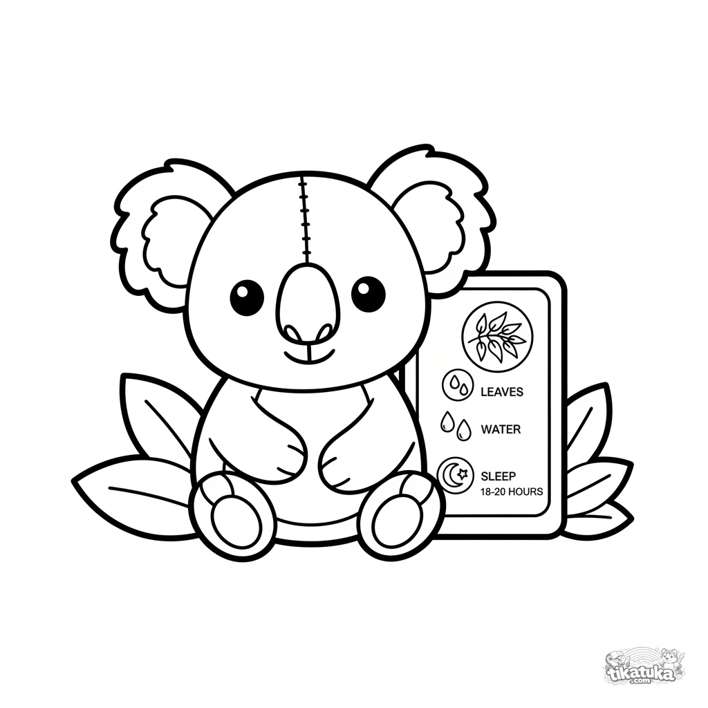 Página para colorear muy simple para niños pequeños: un koala de peluche grande junto a un cartel de su dieta. Formas grandes, márgenes amplios.