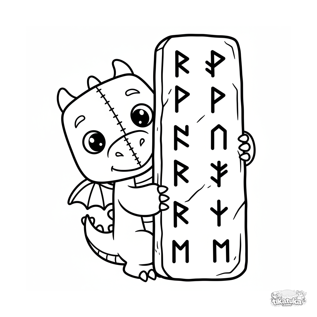 Página para colorear para niños pequeños 2-3: un lindo wyvern de peluche asoma la cabeza desde detrás de una gran piedra rúnica. Formas muy simples y grandes como un juguete, áreas amplias y limpias.