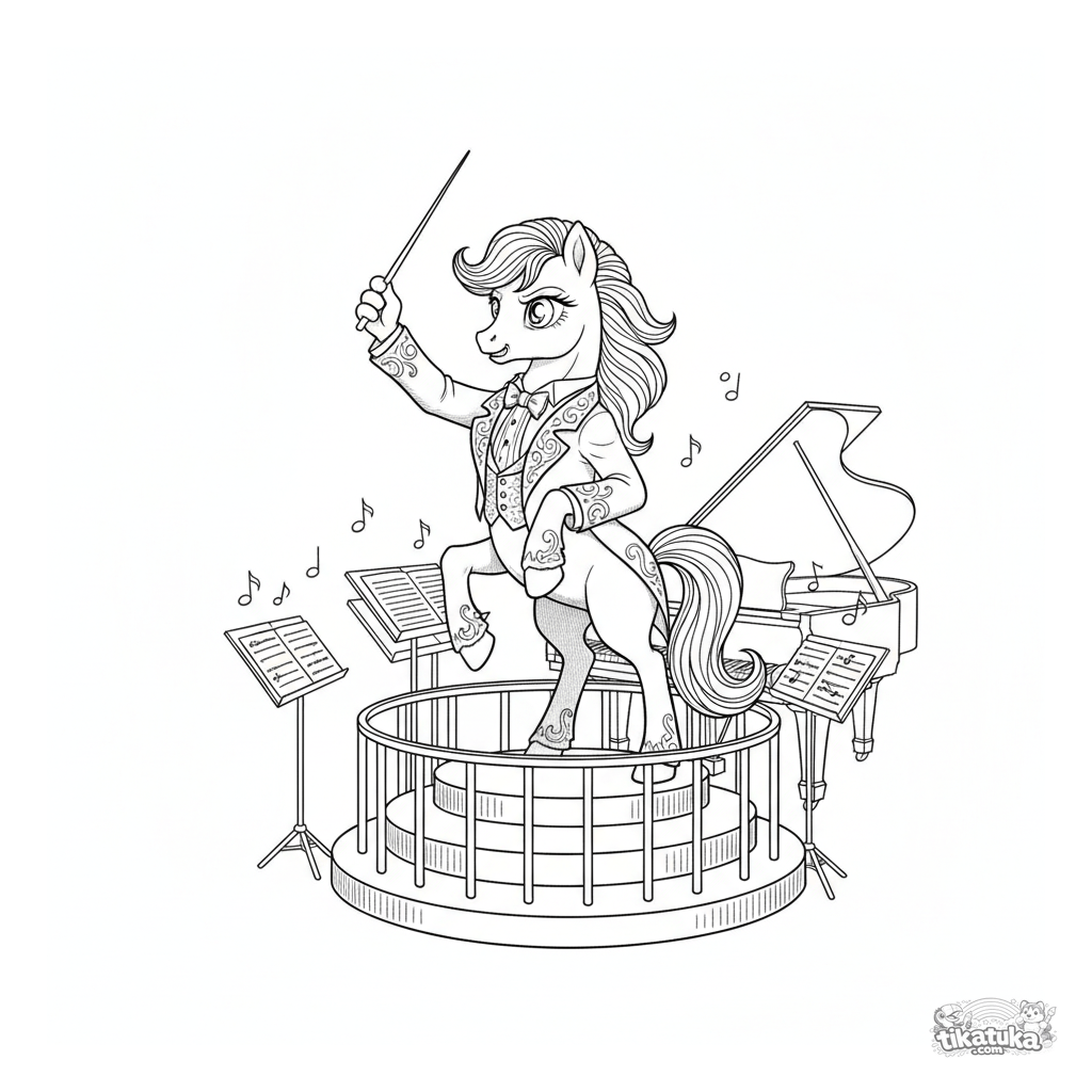 Página para colorear detallada estilo grabado antiguo de un pony director en el foso de orquesta de un teatro. Para niños de 10 a 12 años. Escena con atril y partituras.