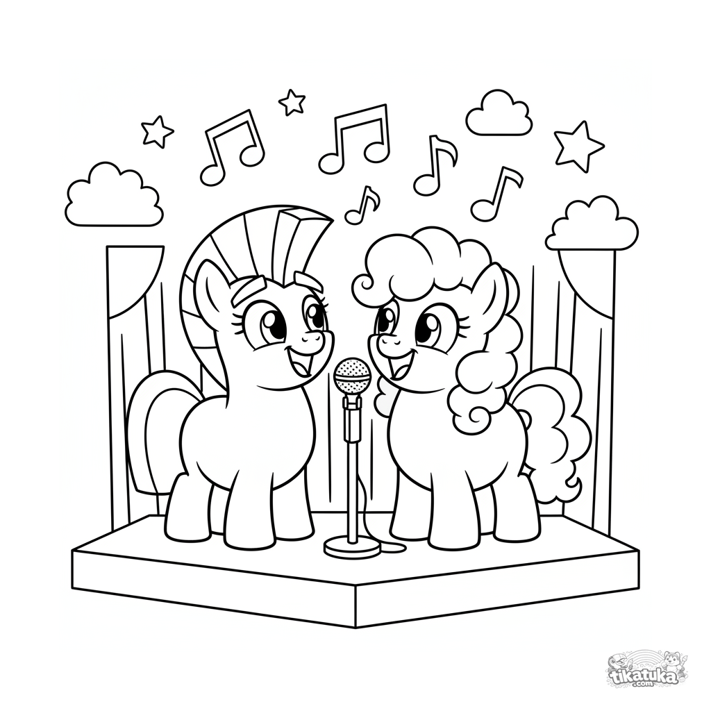 Página para colorear para niños de 4-6 años: dos ponis alegres cantan un dúo en un micrófono en el escenario.