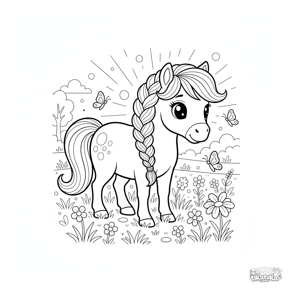 Página para colorear para niñas de 4-6 años: un lindo poni con crin trenzada pasta en un prado lleno de flores silvestres y mariposas. Escena tranquila.