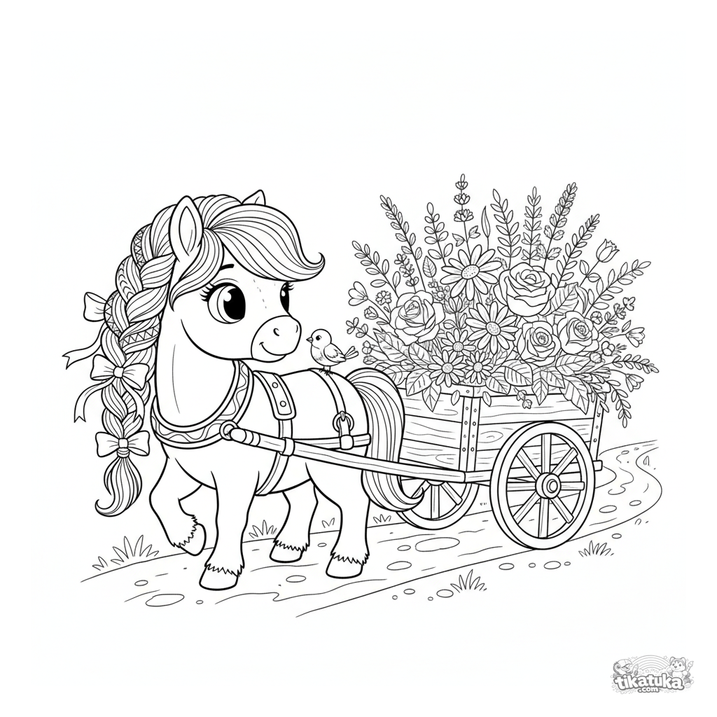 Página para colorear de un lindo poni enganchado a un carro de flores. Para niños de 5 a 8 años. Muchos detalles.