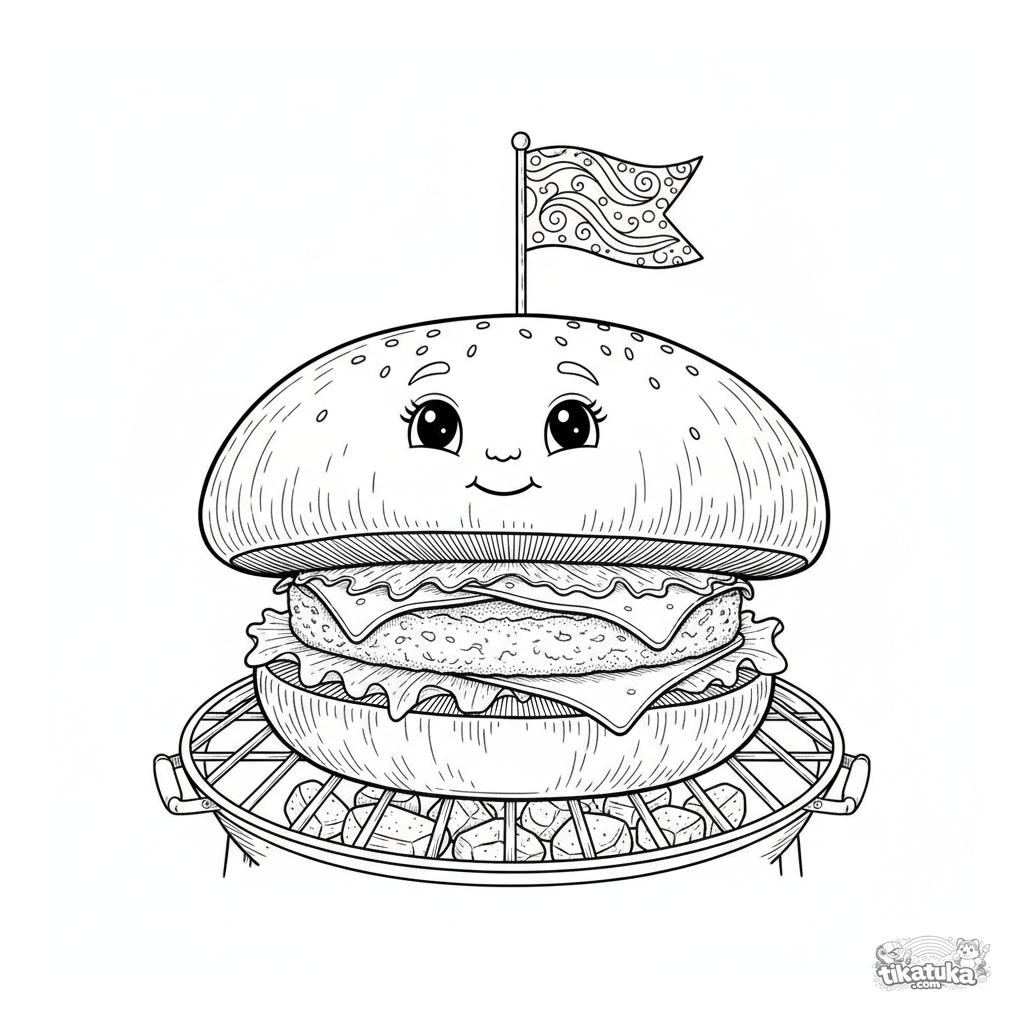 Página compleja para 10-12 años: hamburguesa de champiñón portobello en parrilla de jardín. Líneas detalladas estilo grabado, capas, márgenes.