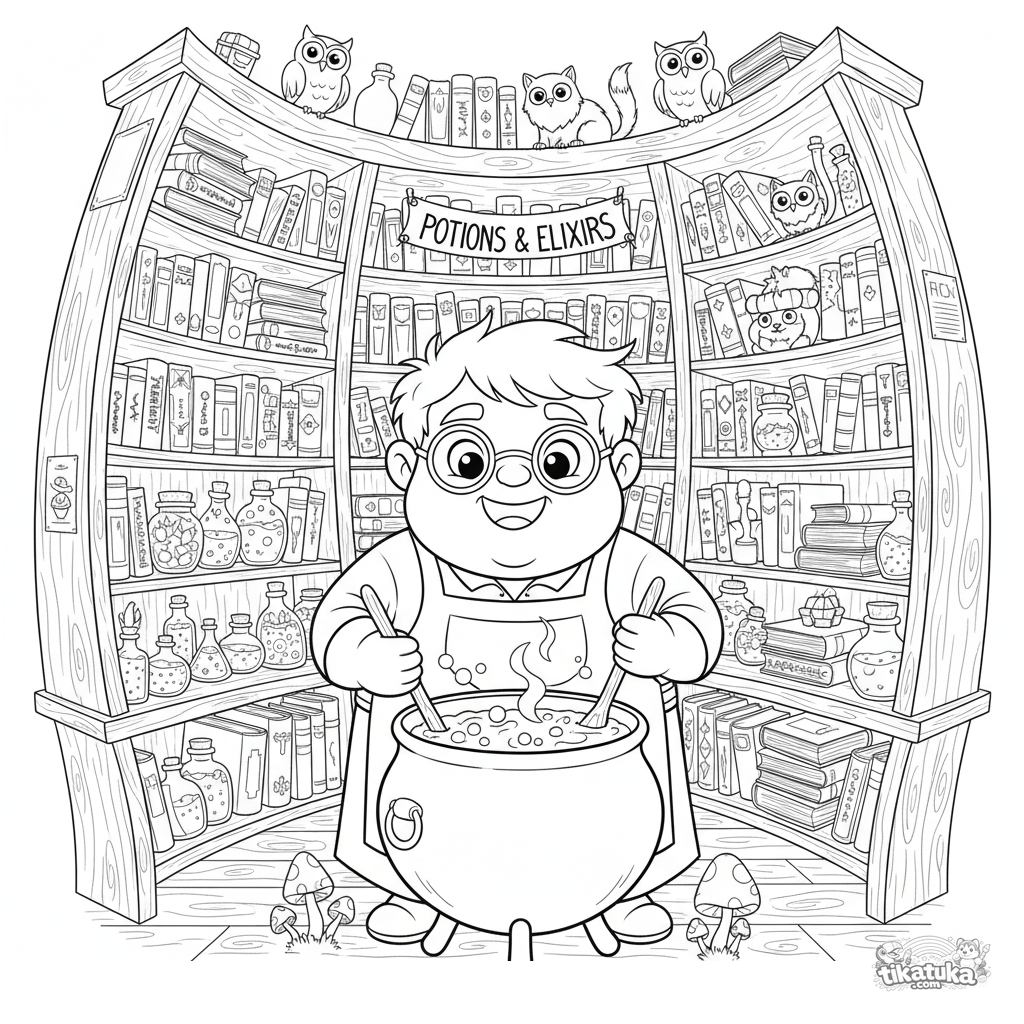Página para colorear para niños 4-6: el dueño de una tienda de pociones prepara una mezcla en su biblioteca mágica. Escena divertida y detallada.