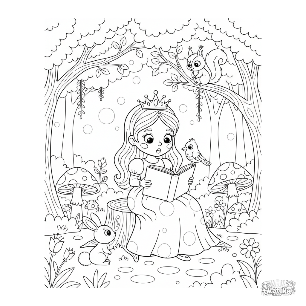 Página para colorear para niñas de 4-6 años: una princesa en un bosque encantado lee un libro a los animales.